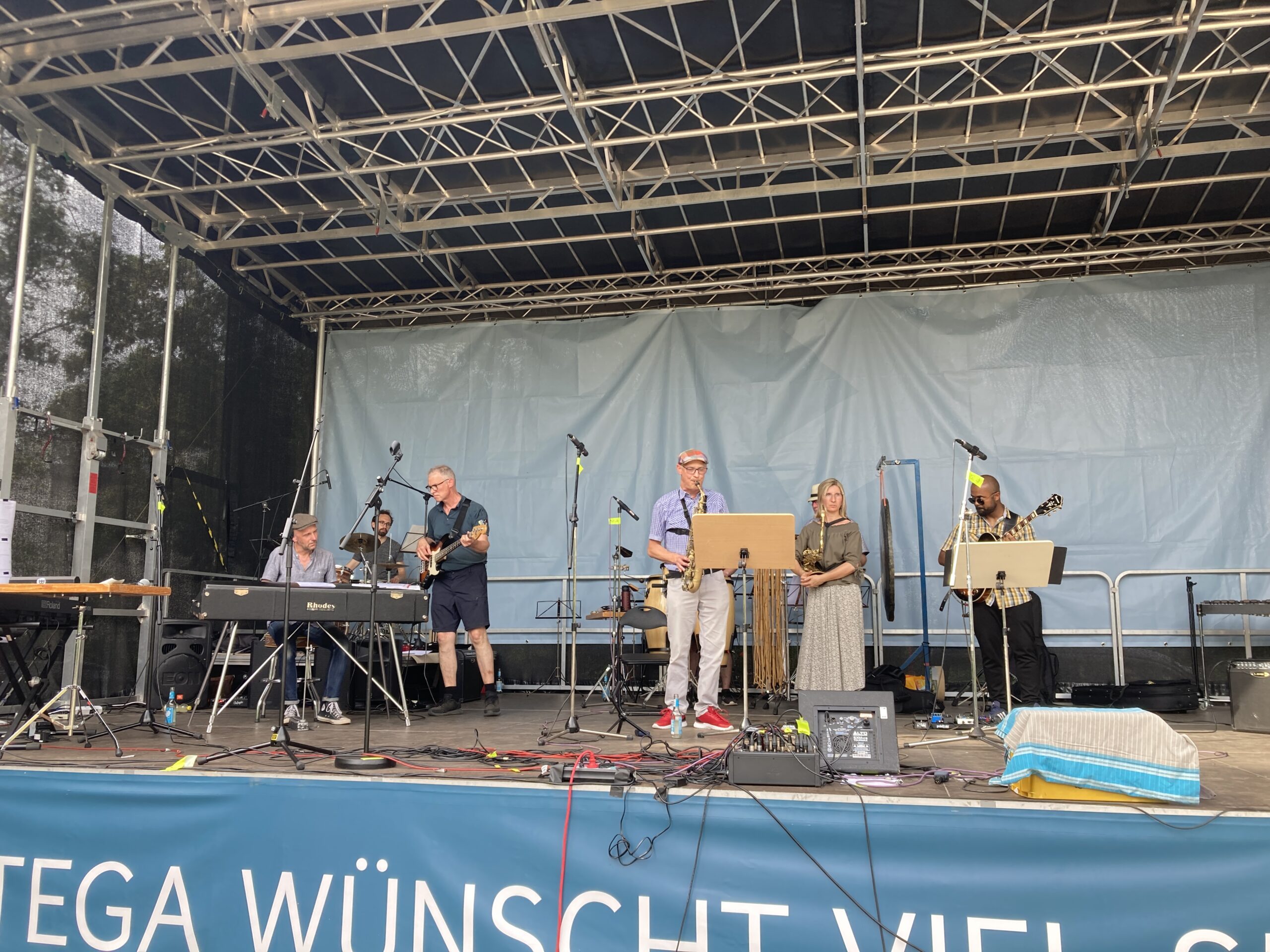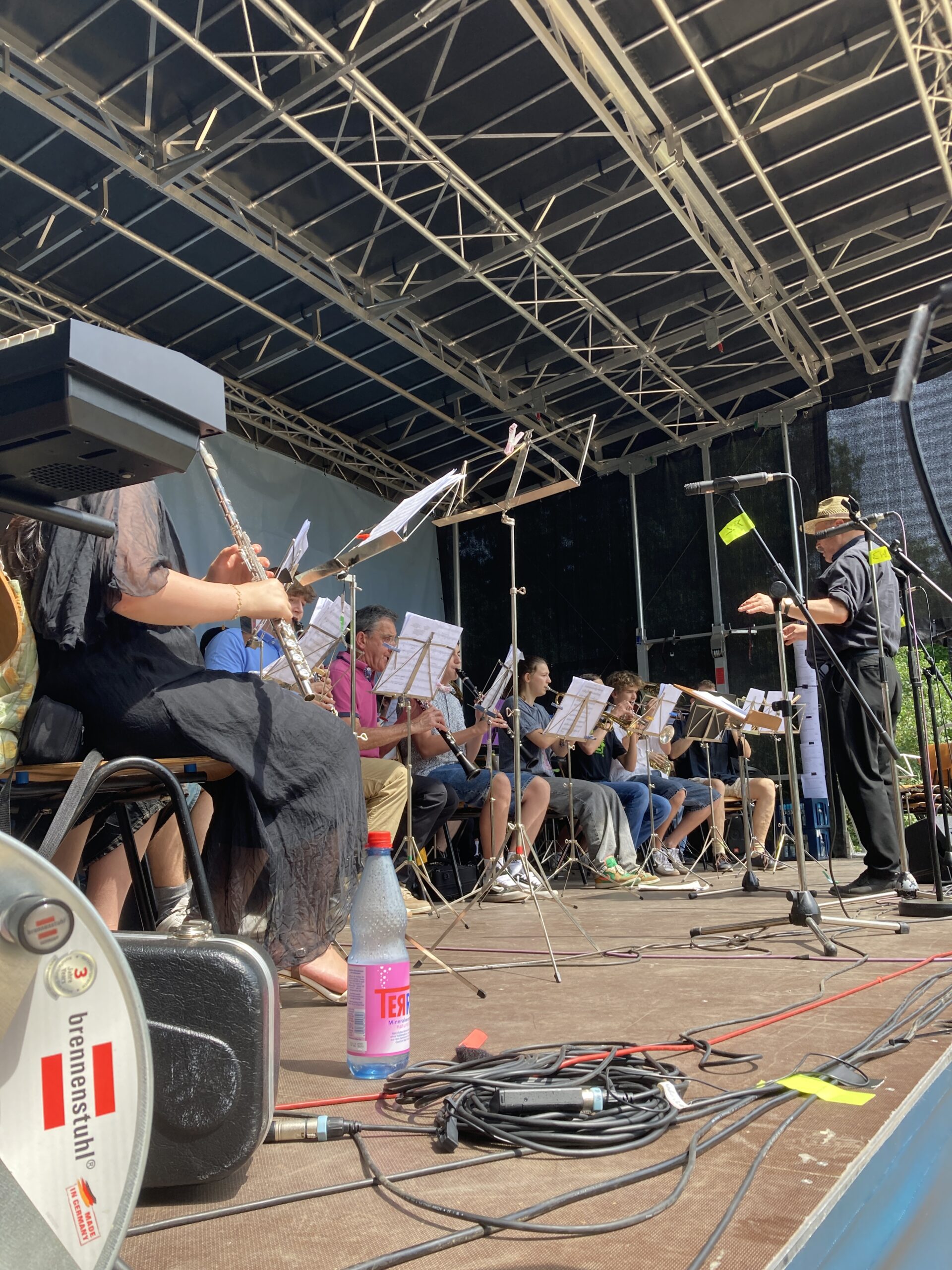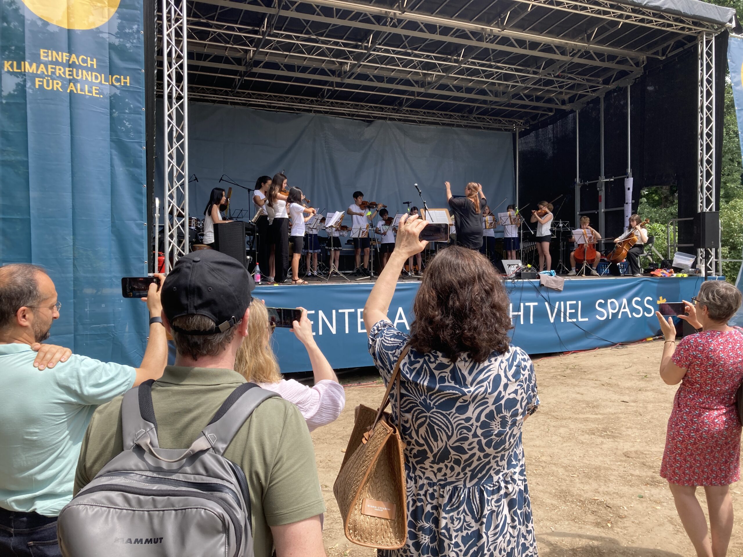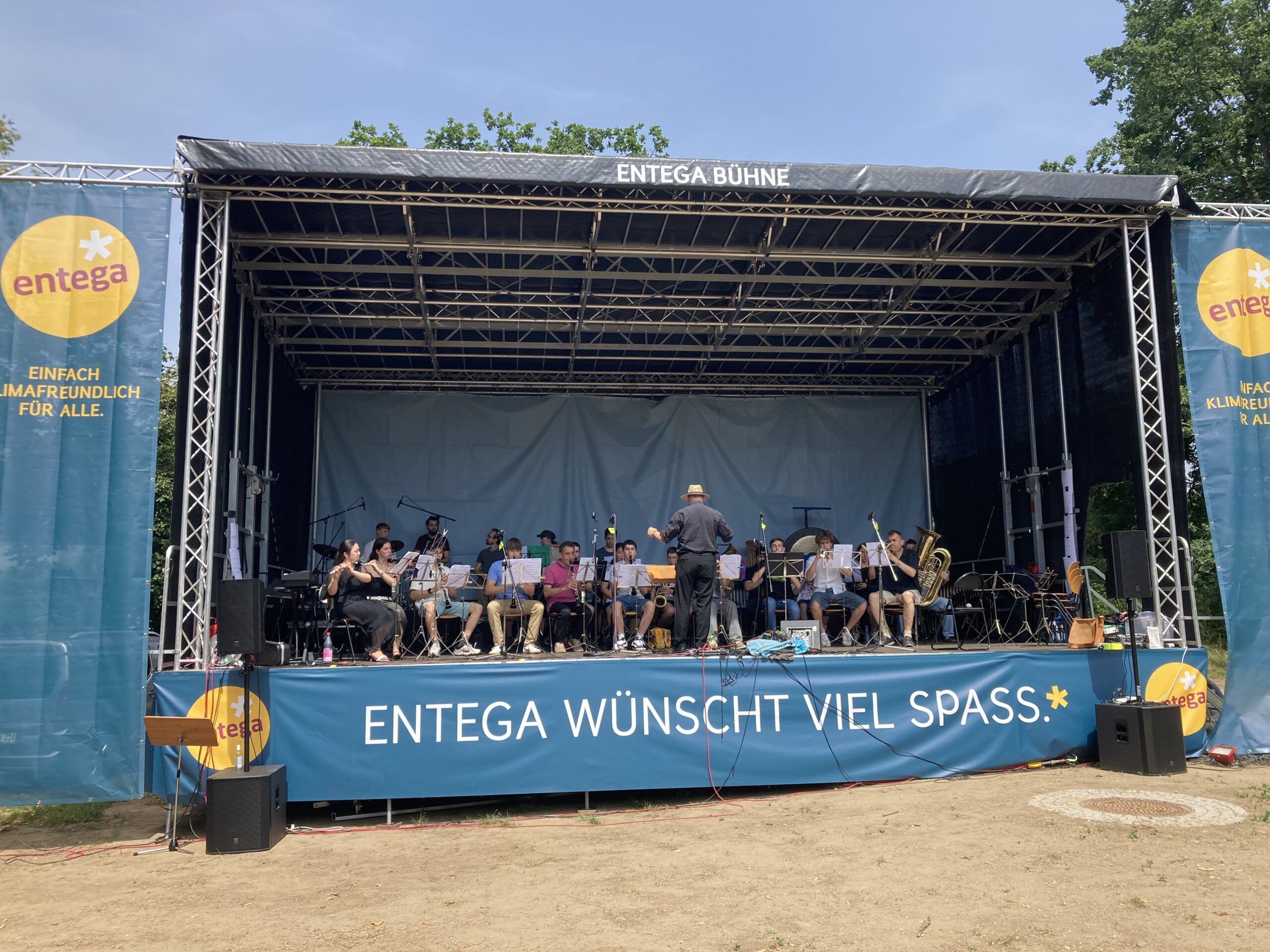 Der Familientag am Samstag bot den Besuchern bei strahlendem Sonnenschein und tropischen Temperaturen die Möglichkeit, sich in Mikrokonzerten und Instrumentenlaboren mit verschiedenen Instrumenten und Ensembles vertraut zu machen. Der Austausch zwischen Besuchern und Musikern bei Kaffee, Kuchen, Pommes, hausgemachten Burgern und Falafel förderte die familiäre Atmosphäre und die Vernetzung. Des gesamte Haus wurde zum Klingen gebracht und die von Entega gesponserte riesige Außenbühne bot Chören, Blasorchestern und Jazz-Combos Platz.